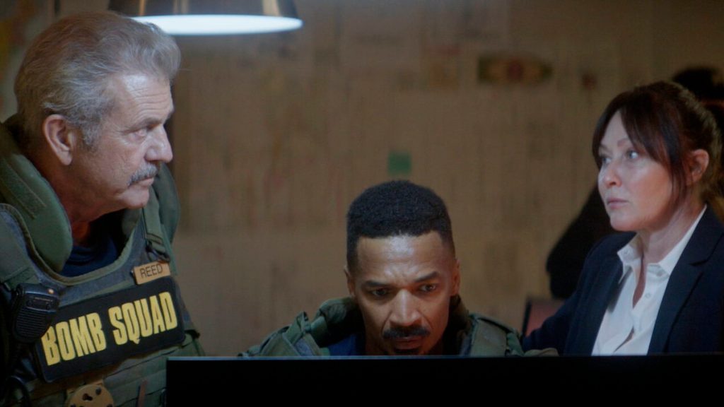 Hot Seat takes us into the world of Orlando Friar (played by Kevin Dillon) who now works in an IT company but whos previous ‘career’ involved computer hacking. Now trying to have a run of the mill every day normal life where he looks after his wife and child. Orlando ends up one day being roped into a crazy scenario which involves using his hacking skills to not only save his own life, but that of Ava (played by Kate Katzman) who find themselves in a work office, wired with explosives. Whilst Orlando frantically follows the verbal instructions of the anonymous bomber, outside the building Bomb Squad officers Wallace Reed (played by Mel Gibson) and Jackson (played by Eddie Steeples) try to work out who exploded a bomb in the city earlier that morning and then find themselves heading into the situation that Orlando and Ava are already in.