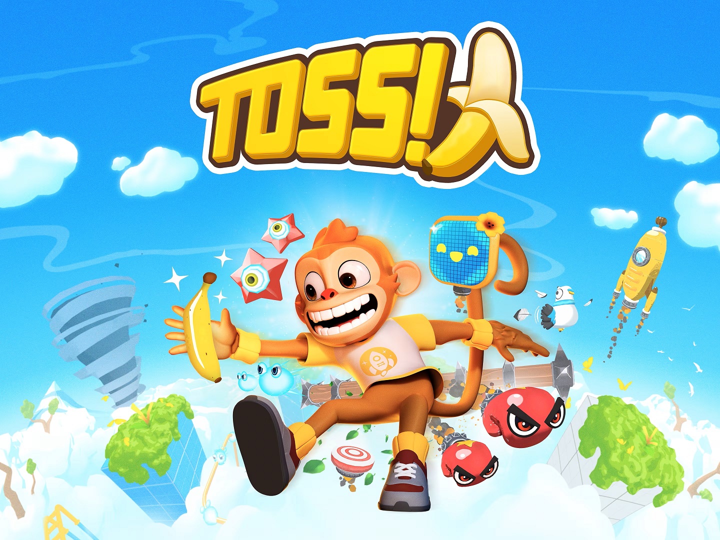 Toss tells the very basic story of your character who has crash landed on a cloud planet (perhaps Bespin) and you apparently have to collect parts to repair your spaceship. The game features 75+ playground levels (which are quiet short) in 9 different cloudscape biomes. The game was and is a lot of fun, super easy to pick up, your VR controllers are your hands (and you see those hands on screen) and you climb up drain pipes, crawl along pipes, up walls, even up tree branches to try and collect (just by touching them) the things you need.
